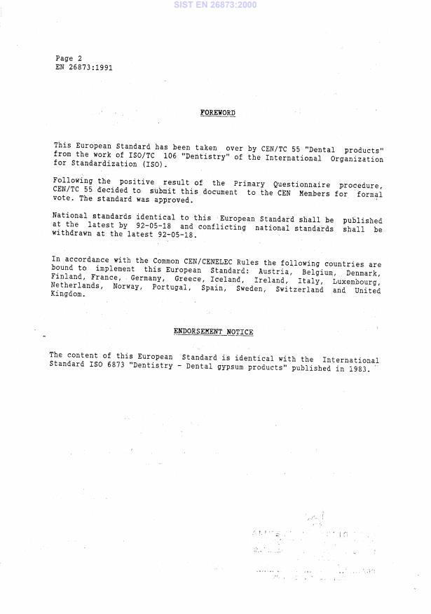 Foreword IS0 (the International Organization for Standardization) is a worldwide federation of national standards bodies (IS0 member bodies). The work of developing International Standards is carried out through IS0 technical committees. Every member body interested in a subject for which a technical committee has been authorized has the right to be represented on that committee. International organizations, governmental and non-governmental, in liaison with ISO, also take part in the work. Draft international Standards adopted by the technical committees are circulated to the member bodies for approval before their acceptance as International Standards by the IS0 Council. International Standard IS0 6873 was developed by Technical Committee ISO/TC 106, Dentistry, and was circulated to the member bodies in March 1982. It has been approved by the member bodies of the following countries : Austria India Sweden Belgium Japan Switzerland Canada Mexico United Kingdom China Netherlands USA Czechoslovakia New Zealand USSR Egypt, Arab Rep. of Norway Germany, F.R. South Africa, Rep. of The member bodies of the following countries expressed disapproval of the document on technical grounds : Australia France O International Organization for Standardization, 1983 0 Printed in Switzerland SIST EN 26873:2000