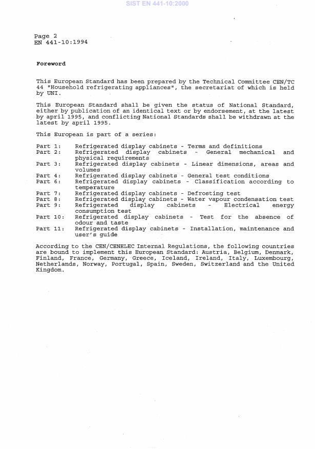 EN 441-10:1994 is a standard published by the European Committee for Standardization (CEN). Its full title is "Refrigerated display cabinets - Part 10: Test for absence of odour and taste". This standard covers: This standard specifies marking and performance requirements, methods of classification, methods of determining dimensions and methods of test for commercial refrigerated cabinets for the sale and display of food products. This standard does not cover refrigerated vending machines. This part specifies methods of test to check that materials used for the internal components of commercial refrigerated cabinets will not impart either taste or odour to food.