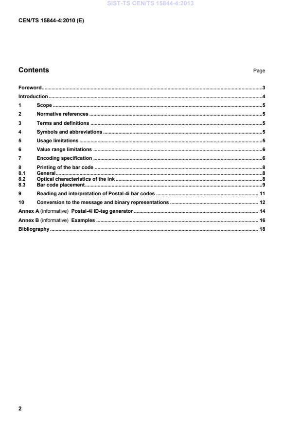 Ta del tehnične specifikacije določa prikaz identifikacijske številke v obliki 4-statusne črtne kode v obliki simbolov Postal-4i na sprednji strani večjih pisem. Številna določila se uporabljajo tudi za navadna pisma in jih zato omenja 5. del specifikacije (CEN/TS 15844-5), ki jih obravnava. 4-statusna črtna koda v obliki simbolov Postal-4i je edina specifikacija kodiranja, ki jo dovoljuje ta tehnična specifikacija (3) za tiskanje identifikacijskih številk na sprednji strani pošiljk. OPOMBA Prikaz v obliki fluorescentnih črtnih kod BNB, natisnjenih na hrbtni strani navadnih pisem (ne večjih pisem), ni obravnavan v standardih CEN/TS 15844-2 in CEN/TS 15844-3.