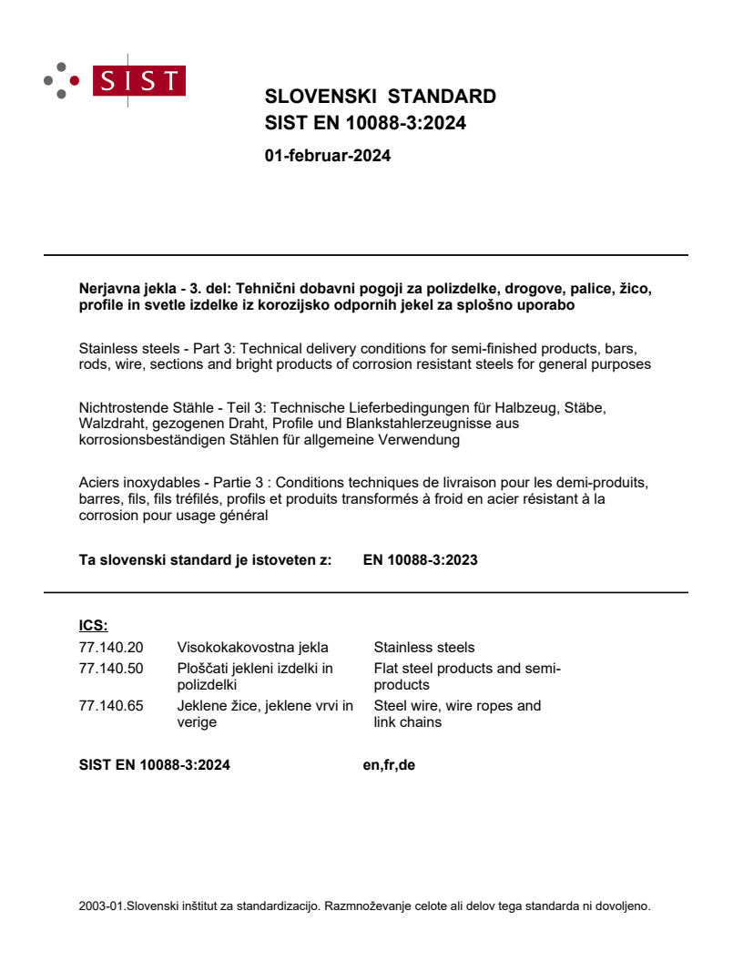 Nerjavna jekla - 3. del: Tehnični dobavni pogoji za polizdelke, drogove, palice, žico, profile in svetle izdelke iz korozijsko odpornih jekel za splošno uporabo