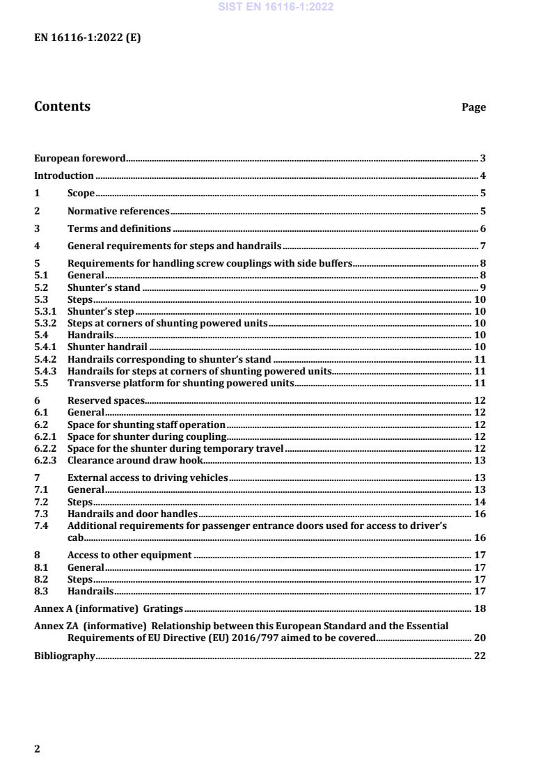 EN 16116-1:2022 is a standard published by the European Committee for Standardization (CEN). Its full title is "Railway applications - Design requirements for steps, handrails and associated access for staff - Part 1: Passenger vehicles, vans and locomotives". This standard covers: This document specifies the minimum ergonomic and structural integrity requirements for steps and handrails used by staff to access the following heavy rail vehicles: — passenger vehicles; — vans; — locomotives; — power units of rolling stock; — passenger-rated car carriers. This document defines the required spaces necessary for shunter handrails and shunter’s stand and gives references for the required spaces necessary for handling of screw couplings with side buffers. For staff access, it defines footsteps, handrails and their dimensions and free spaces. To fulfil the requirements for loads which are applied by the staff, it defines dimensions and requirements for materials or design loads. This document also defines the general requirements of steps and handrail for access to external equipment, for example windscreens, wipers or external lights.