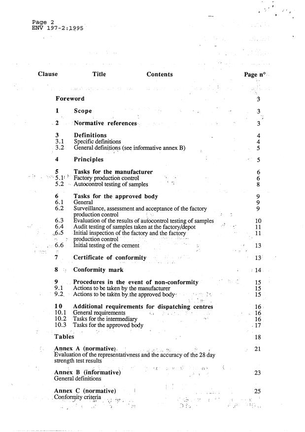 ENV 197-2:1995 is a standard published by the European Committee for Standardization (CEN). Its full title is "Cement - Part 2: Conformity evaluation". This standard covers: This European Pre-standard describes the scheme for the evaluation of conformityof cement complying with the requirements of ENV 197-1. NOTE: During the pre-standard stage this document is intended to assist in the convergence of existing national schemes for conformity evaluation.