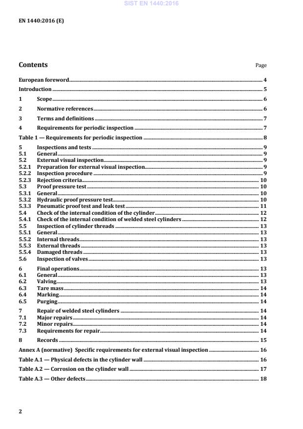 Specific requirements for external visual inspection . 16 Table A.1 — Physical defects in the cylinder wall . 16 Table A.2 — Corrosion on the cylinder wall . 17 Table A.3 — Other defects . 18 SIST EN 1440:2016