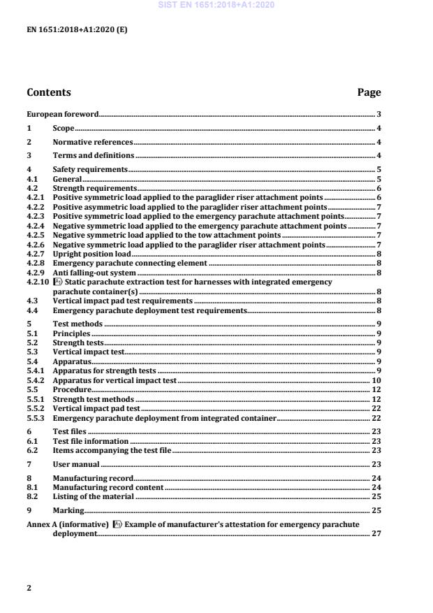 EN 1651:2018+A1:2020 - "Paragliding equipment - Harnesses - Safety requirements and strength tests" is a European Standard published by CEN that specifies safety requirements and test methods for paragliding harnesses. It applies exclusively to harnesses for paragliders; the intermediate attachment system between the harness and the paraglider is explicitly excluded. The document includes Amendment 1 (A1) and covers requirements from design and marking through laboratory strength and deployment tests.