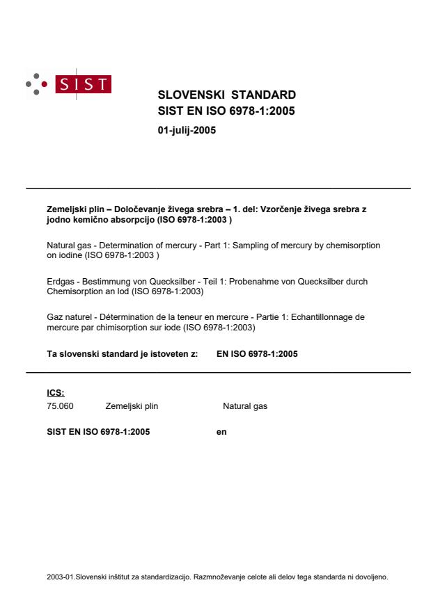 Zemeljski plin – Določevanje živega srebra – 1. del: Vzorčenje živega srebra z jodno kemično absorpcijo (ISO 6978-1:2003 )