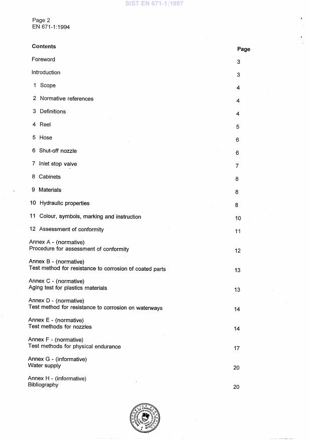 EN 671-1:1994 is a standard published by the European Committee for Standardization (CEN). Its full title is "Fixed firefighting systems - Hose systems - Part 1: Hose reels with semi-rigid hose". This standard covers: Please read the qualifying note at the end of the summary of the directive. This European Standard specifies requirements and methods of test for construction and performance for fire hose reel systems with semi-rigid hose for installation in buildings and other construction works, permanently connected to a water supply, for use by the occupants. Its requirements may apply in general for other applications, for example in marine applications or in aggressive environments, but additional requirements may be necessary in such cases. This standard is applicable to both manual or automatic fire hose reels for installation with and without cabinets. For convenient application in conformity testing the normative annexes of this standard are arranged, so that Annex A gives the sequence of testing for conformity assessment and Annexes B, C, D, E and F are in the correct sequence for testing. Annex G gives recommendations for the flowrate, pressure and capacity of water supplies. Note: All pressures are gauge pressures and are expressed in megapascals. 1 MPa = 10 bar.