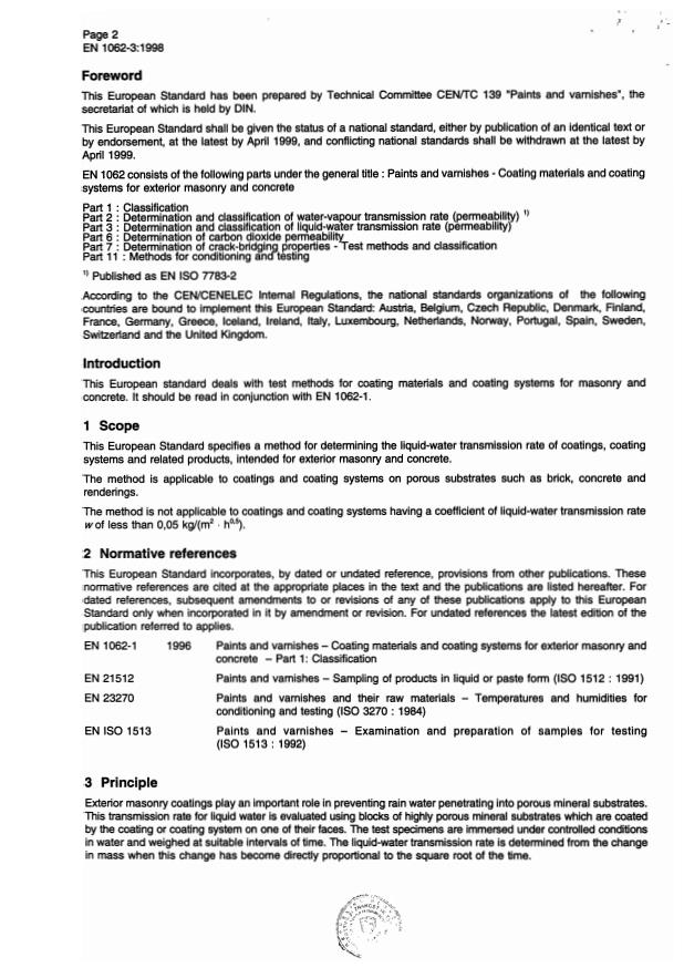 EN 1062-3:1998 is a standard published by the European Committee for Standardization (CEN). Its full title is "Paints and varnishes - Coating materials and coating systems for exterior masonry and concrete - Part 3: Determination and classification of liquid-water transmission rate (permeability)". This standard covers: This European Standard specifies a method for determining the liquid-water transmission rate of coatings, coating systems and related products, intended for exterior masonry and concrete. The method is applicable to coatings and coating systems on porous substrates such as brick, concrete and renderings. The method is not applicable to coatings and coating systems having a coefficient of liquid-water transmission rate w of less than 0,05 kg/(m2 . h0,5).