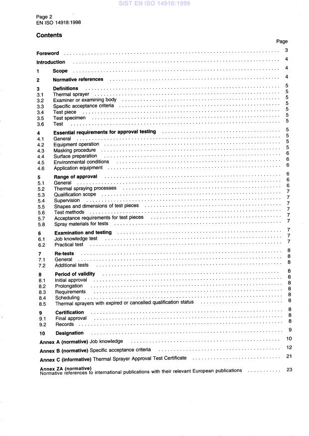 EN ISO 14918:1998 is a standard published by the European Committee for Standardization (CEN). Its full title is "Thermal spraying - Approval testing of thermal sprayers (ISO 14918:1998)". This standard covers: This standard gives procedural instructions for approval testing of thermal sprayers. It defines essential requirements, ranges of approval, test conditions, acceptance requirements and certification for approval testing of thermal spray performance. During the approval test the thermal sprayer shall be required to show adequate practical experience and job knowledge of thermal spraying processes, materials and safety requirements for which he is to be approved; information on these aspects is given in Annex A.