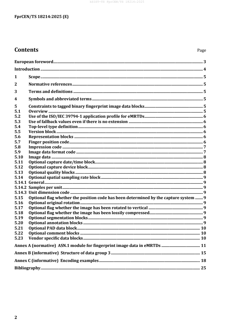 CEN/TS 18214:2025 is a draft published by the European Committee for Standardization (CEN). Its full title is "ISO/IEC 39794-4 application profile for finger image data in machine-readable travel documents". This standard covers: The eighth edition of ICAO Doc 9303 progresses from using the first edition of the ISO/IEC 19794 series for encoding biometric reference data in electronic machine-readable travel documents to using the ISO/IEC 39794 series for this purpose. This document specifies how to use ISO/IEC 39794-4 for fingerprint image data stored in electronic machine-readable travel documents.