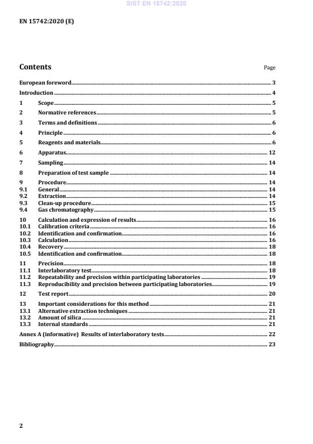 EN 15742:2020 is a standard published by the European Committee for Standardization (CEN). Its full title is "Animal feeding stuffs: Methods of sampling and analysis - Determination of OCPs by GC-ECD". This standard covers: This document specifies a gas chromatographic method with electron capture detection (ECD) for the determination of organochlorine pesticides (OCPs) in compound feeds and oil and fats. The method is applicable to animal compound feed, oils and fats and fish meals with a water content up to about 20 % by weight and oil/fatty samples containing residues of one or more of the following OCPs, toxaphene and some of their isomers and degradation products: — aldrin; — dieldrin; — dichlorodiphenyltrichloroethane (DDT) (the isomers op'-DDT, pp'-DDT, pp'-TDE (pp'-DDD), and pp'-DDE); — endosulfan (as the sum of α-/β-isomers); — endrin; — hexachlorobenzene (HCB); — hexachlorocyclohexane isomers α-HCH (α-BHC), β-HCH (β-BHC), γ-HCH (γ-BHC or lindane); For the following OCPs, the method is considered a screening method. Additional in-house validation is required for reporting validated data. — chlordane (as the sum of chlordane isomers and oxychlordane); — endosulfan-sulphate; — delta-keto-endrin; — heptachlor (as the sum of heptachlor and heptachlor epoxide); — photo-heptachlor; — cis — and trans-nonachlor. A limit of quantification (LOQ) for the mentioned OCPs of 5 µg/kg is intended to be obtained. However, 10 µg/kg applies for heptachlor, aldrin, endrin, dieldrin, and endosulfan (α-/β– and sulphate). Individual laboratories are responsible for ensuring that the equipment that they use, achieves these limits of quantifications. The LOQs apply to the individual OCPs.