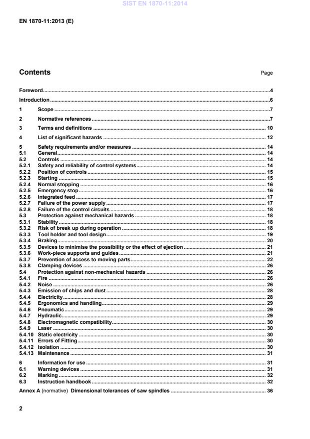 Foreword .4 Introduction .6 1 Scope .7 2 Normative references .7 3 Terms and definitions . 10 4 List of significant hazards . 12 5 Safety requirements and/or measures . 14 5.1 General . 14 5.2 Controls . 14 5.2.1 Safety and reliability of control systems . 14 5.2.2 Position of controls . 15 5.2.3 Starting . 15 5.2.4 Normal stopping . 16 5.2.5 Emergency stop . 16 5.2.6 Integrated feed . 17 5.2.7 Failure of the power supply . 17 5.2.8 Failure of the control circuits . 18 5.3 Protection against mechanical hazards . 18 5.3.1 Stability . 18 5.3.2 Risk of break up during operation . 18 5.3.3 Tool holder and tool design . 19 5.3.4 Braking . 20 5.3.5 Devices to minimise the possibility or the effect of ejection . 21 5.3.6 Work-piece supports and guides . 21 5.3.7 Prevention of access to moving parts . 22 5.3.8 Clamping devices . 26 5.4 Protection against non-mechanical hazards . 26 5.4.1 Fire . 26 5.4.2 Noise . 26 5.4.3 Emission of chips and dust . 28 5.4.4 Electricity . 28 5.4.5 Ergonomics and handling . 29 5.4.6 Pneumatic . 29 5.4.7 Hydraulic . 29 5.4.8 Electromagnetic compatibility . 30 5.4.9 Laser . 30 5.4.10 Static electricity . 30 5.4.11 Errors of Fitting . 30 5.4.12 Isolation . 30 5.4.13 Maintenance . 31 6 Information for use . 31 6.1 Warning devices . 31 6.2 Marking . 32 6.3 Instruction handbook . 32 Annex A (normative)