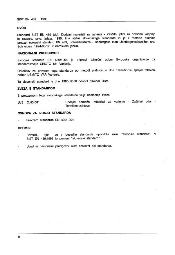 EN 439:1994 is a standard + national annex and/or foreword published by the European Committee for Standardization (CEN). Its full title is "Welding consumables - Shielding gases for arc welding and cutting". This standard covers: This standard is applicable to gas shielded arc welding and cutting processes with gases and gas mixtures defined within. Applications include, but are not limited to : - tungsten inert gas (TIG) welding, - metal active gas (MAG) welding, - metal inert gas (MIG) welding, - plasma arc welding (PAW), - plasma arc cutting (PC), - back shielding