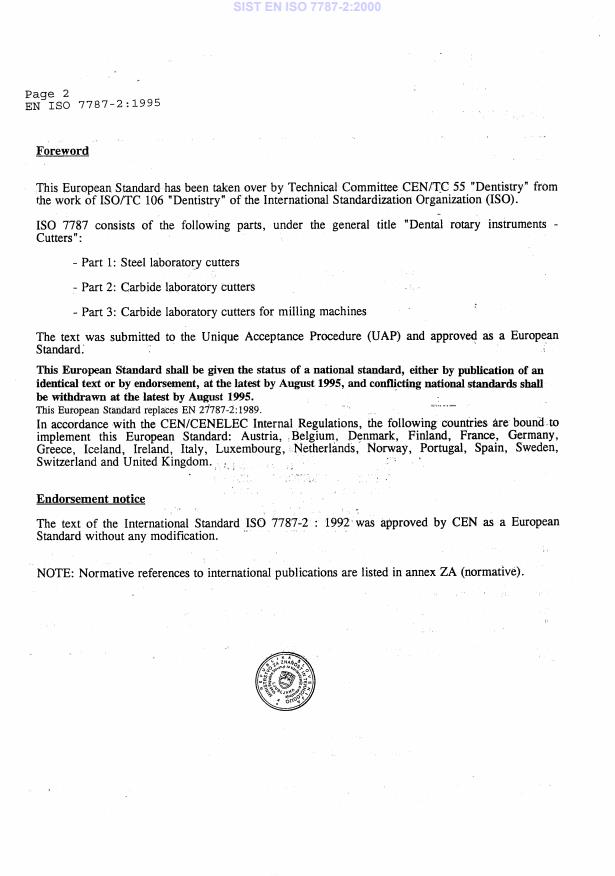 EN ISO 7787-2:1995 is a standard published by the European Committee for Standardization (CEN). Its full title is "Dental rotary instruments - Cutters - Part 2: Carbide laboratory cutters (ISO 7787-2:1992)". This standard covers: Dieser Teil von ISO 7787 enthält Maße und sonstige Anforderungen für die 15 am häufigsten verwendeten Hartmetallfräser, die vorwiegend im Dentallabor verwendet werden. Andere Eigenschaften von Fräsern, z.B. Spiralverzahnungen, Querhieb, sind in diesem Teil der ISO 7787 nicht enthalten. Sie werden Gegenstand einer zukünftigen Internationalen Norm sein. Hingewiesen wird auf die ISO 6360, in der ein 15 stelliges Nummernsystem für die Identifizierung von zahnärtzlichen rotierenden Instrumenten aller Art festgelegt ist.