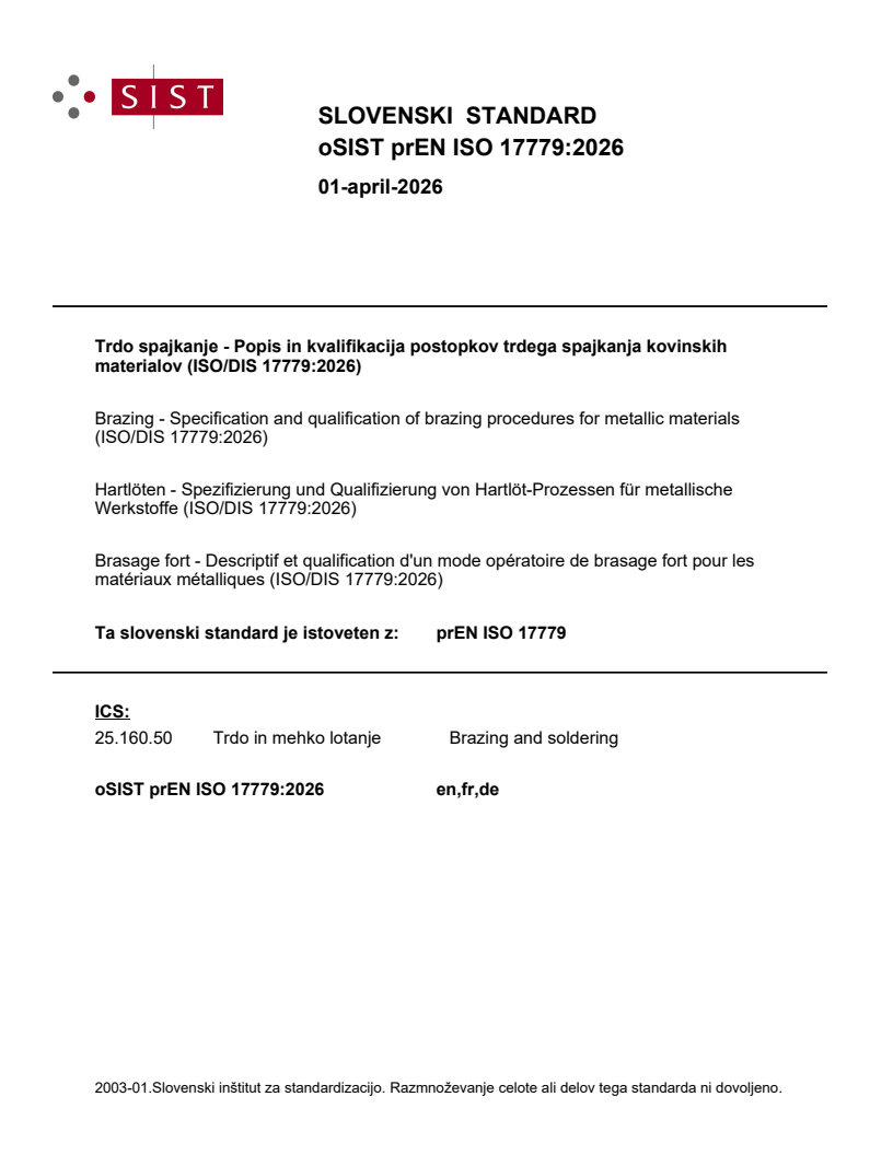 Trdo spajkanje - Popis in kvalifikacija postopkov trdega spajkanja kovinskih materialov (ISO/DIS 17779:2026)
