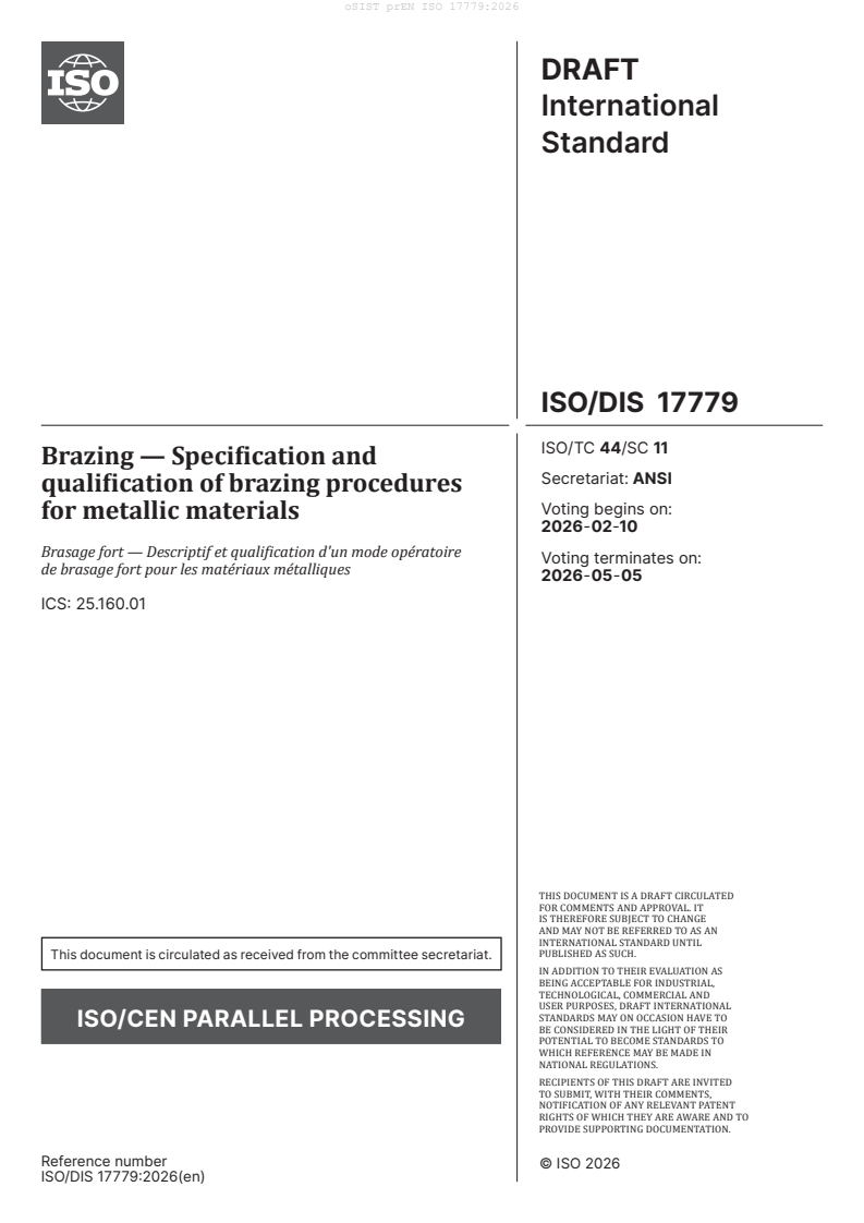 Brazing - Specification and qualification of brazing procedures for metallic materials (ISO/DIS 17779:2026)