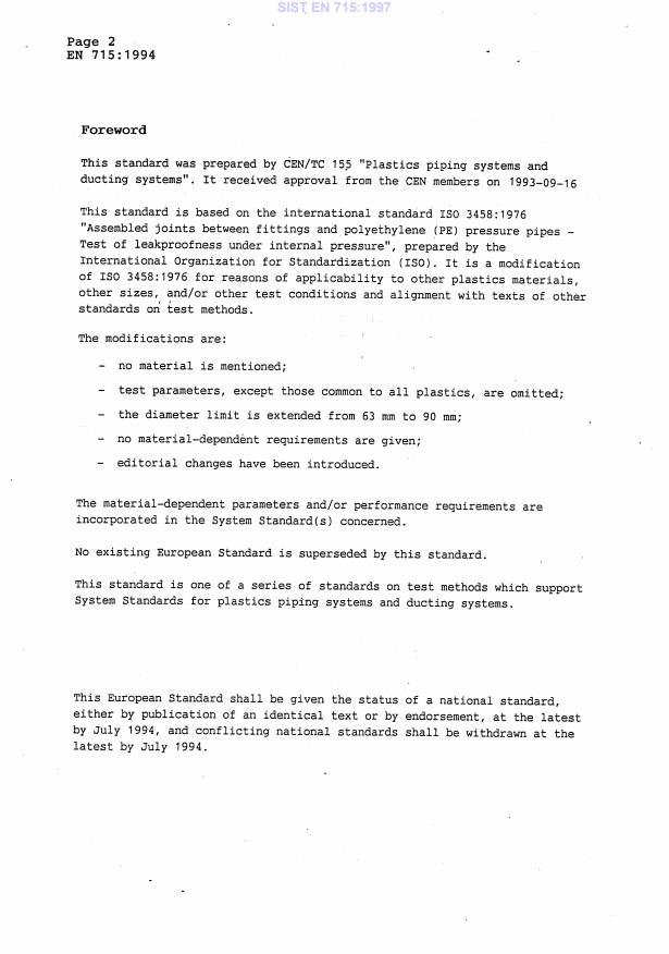 EN 715:1994 is a standard published by the European Committee for Standardization (CEN). Its full title is "Thermoplastics piping systems - End-load bearing joints between small diameter pressure pipes and fittings - Test method for leaktightness under internal water pressure, including end thrust". This standard covers: This standard specifies a method for testing the leaktightness of end-load bearing joints, e.g. cemented joints and assembled joints (excluding fusion- welded joints), between mechanical fittings and thermoplastics pipes under internal water pressure, including end thrust, of diameters up to and including 90mm. The method is applicable regardless of the design and material of the fitting used for jointing pipes.