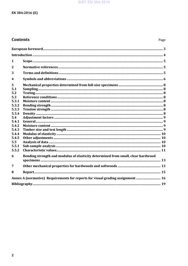 EN 384:2016 is a standard published by the European Committee for Standardization (CEN). Its full title is "Structural timber - Determination of characteristic values of mechanical properties and density". This standard covers: This standard gives a method for determining characteristic values of mechanical properties and density, for defined populations of visual grades and/or mechanical strength classes of sawn timber. Additionally it covers the stages of sampling, testing, analysis and presentation of the data. A method is also given for checking the strength of a timber population against its designated value. The values determined in accordance with this standard for mechanical properties and density are suitable for assigning grades and species to the strength classes of EN 338. NOTE 1 For assigning grades and species to the strength classes in EN 338 only three characteristic values, i.e. bending or tension strength, mean modulus of elasticity parallel to grain in bending or tension and density need to be determined, other properties can be calculated according to Tab. 6.2. NOTE 2 EN 1912 gives examples of established visual grades assigned to strength classes.