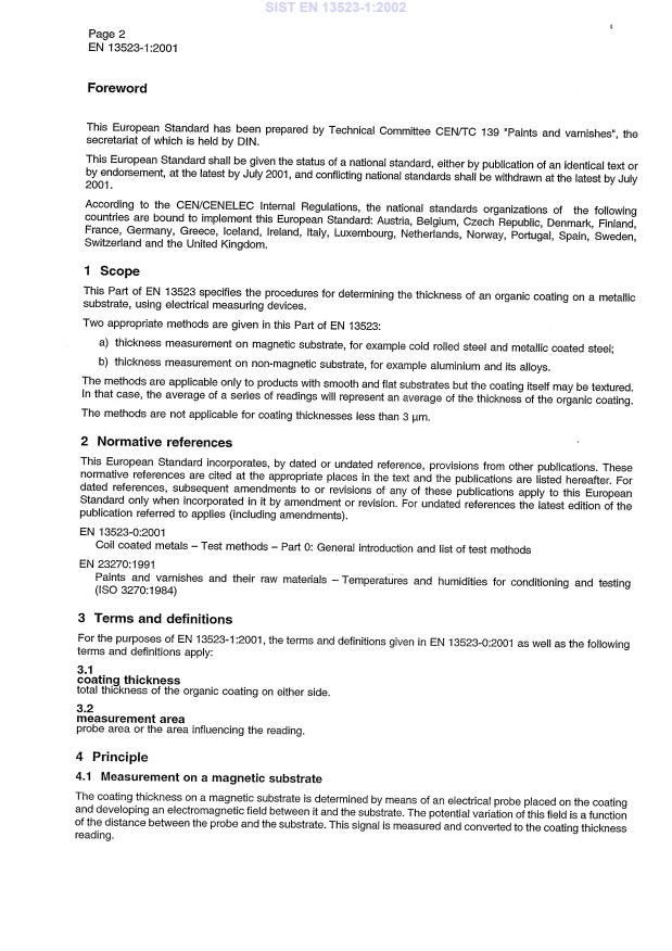 EN 13523-1:2001 is a standard published by the European Committee for Standardization (CEN). Its full title is "Coil coated metals - Test methods - Part 1: Coating thickness". This standard covers: This part of EN 13523 describes procedures for determining the thickness of an organic coating on a metallic substrate, using electrical measuring devices.