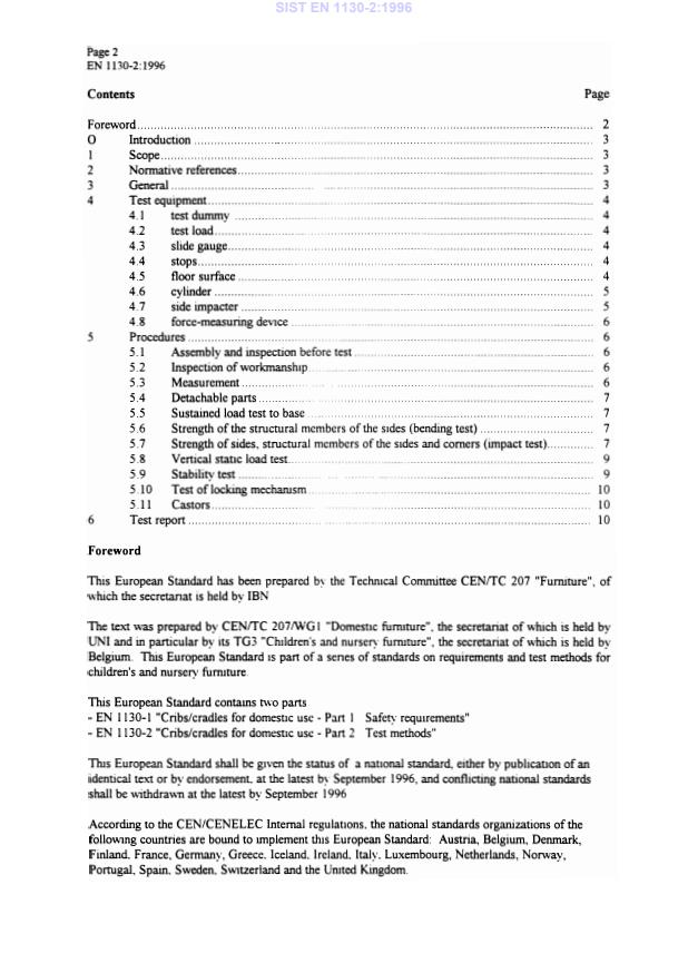 EN 1130-2:1996 is a standard published by the European Committee for Standardization (CEN). Its full title is "Furniture - Cribs and cradles for domestic use - Part 2: Test methods". This standard covers: This part of prEN 1130 describes test methods that assess the safety of cribs and cradles for domestic use. The tests are designed to be applied to cribs/cradles that are fullly assembled and ready for use. NOTE: The test results are only valid for the article tested. When the test results are intended to be applied to other similar articles, the test specimen should be representative of the production model.