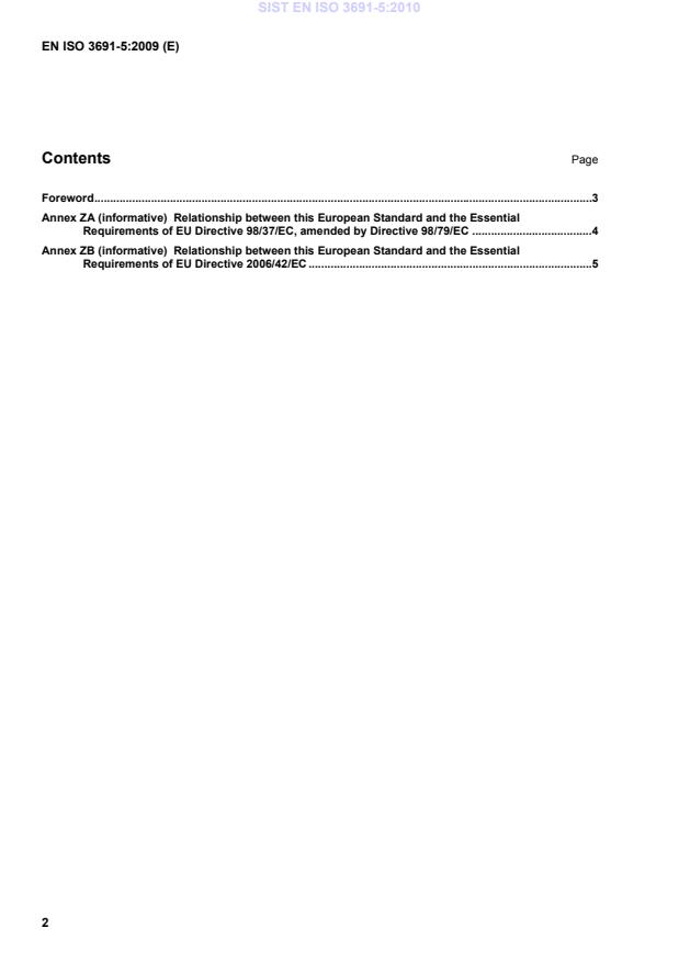 Relationship between this European Standard and the Essential Requirements of EU Directive 2006/42/EC This European Standard has been prepared under a mandate given to CEN by the European Commission and the European Free Trade Association to provide a means of conforming to Essential Requirements of the New Approach Machinery Directive 2006/42/EC. Once this standard is cited in the Official Journal of the European Union under that Directive and has been implemented as a national standard in at least one Member State, compliance with the normative clauses of this standard confers, within the limits of the scope of this standard, a presumption of conformity with the corresponding Essential Requirements of that Directive and associated EFTA regulations. WARNING — Other requirements and other EU Directives may be applicable to the product(s) falling within the scope of this standard. SIST EN ISO 3691-5:2010