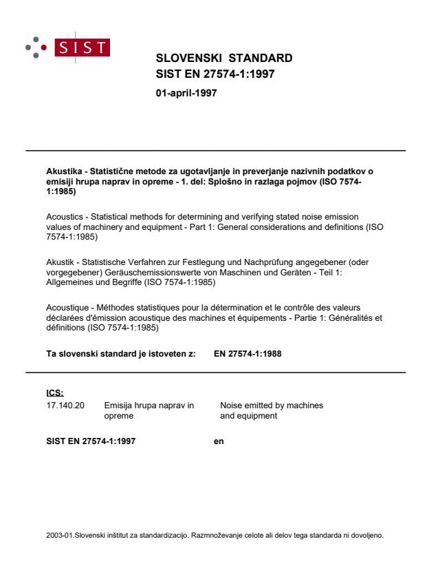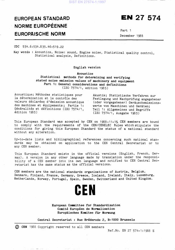 EN 27574-1:1988 is a standard published by the European Committee for Standardization (CEN). Its full title is "Acoustics - Statistical methods for determining and verifying stated noise emission values of machinery and equipment - Part 1: General considerations and definitions (ISO 7574-1:1985)". This standard covers: Defines terms relating to the procedures. Applies both to machines which are produced in very small quantities as well as to machines which are produced by mass production methods.