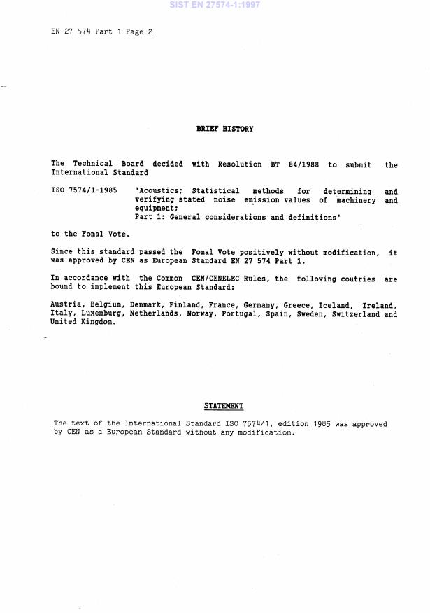 INTERNATIONAL STANDARD ISO 7574/1-1985 (EI Acoustics - Statistical methods for determining and . verifying stated noise emission values of machinery and equipment - Part 1: General considerations and definitions 0 Introduction to ISO 7574 In Order to state the noise emission value for a machine or a batch of machines in an unambiguous manner, this four-patt series of International Standards provides guidelines for deter- mining the noise emission value to be stated (e.g. as a labelled value) and specifies verification procedures. These methods are based on the premise of clearly defined acoustical measure- ment methods and describe the handling of the variability of the measurement results and, if relevant, of the noise emissions of the machines in a batch. The methods presented in this series of International Standards are compatible with the requirements specified in ISO 4871, i.e., - the stated (e.g. labelled) value indicates the limit below which the noise emission value of the individual machine and/or a specified large proportion of the noise emission values of the batch lies; - the basic noise emission quantity used is the A-weighted Sound power level. Although this series of International Standards is drafted mainly in terms of A-weighted Sound power level as a noise emission quantity, it is equally applicable to other quantities. In this series of International Standard the term “label” is con- sidered to include all means for providing information on the noise emission values to potential users of the equipment; this includes labels, brochures, advertisements, commercial literature, etc. Requirements for this may be stipulated, for ex- ample in a contract or in regulations. The methods described may be applied not only to values stated for labelling purposes, but also to values stated for other purposes, for example : - to the upper noise limit set by an authority or specified in a technical Standard for a specific family of machines; - to contract values as agreed by the manufacturer and purchaser of the machine(s). This series of International Standards does not specify whether, or for which specific family of machines, the purposes mentioned above are relevant or whether the methods for determining and verifying stated noise emission values should be applied. This is left to a labelling code specific to the machinery or equipment concerned or, if this does not exist, to an agreement between the users of the Standards (e.g. in a contract). Two cases are considered: - the stated value is given for one individual machine; - the stated value is given for an entire batch of machines. For economic reasons, the stated values for batches of series- produced machines may be verified by sampling procedures. This four-part series of International Standards does not deal with the consequences that ensue if the stated value is not verified for a Single machine or for a batch (lot) of machines. This series of International Standards which comprise ISO 7574 requires that the labelled value be determined using the same measurement test code as that specified for verification. lt therefore applies to families of machines or equipment for which special measurement test Codes for the determination of noise emission quantities are prepared. If no special test code for a particular family exists, the methods specified in ISO 3741, ISO 3742, ISO 3743, ISO 3744 and ISO 3745 may be appropriate. NOTE - This does not preclude the use of other International Stan- dards, e.g. ISO 3746, which may form the basis of special measure- ment test Codes. In each case the installation and operating conditions typical for normal use shall be clearly specified or agreed. The relevant measurement conditions may provide information, in the form of Standard deviations, on the dispersion of measurement results. A measure for the dispersion of the emis- sion values due to the different emissions of the different machines is the Standard deviation of production (sec 3.18). The series of International Standards which make up ISO 7574 comprises the following four Parts: Part 1: General considerations and definitions 1 SIST EN 27574-1:1997