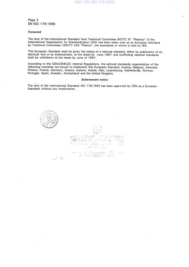 INTERNATIONAL STANDARD IS0 178:1993(E) Plastics - Determination of flexural properties 1 Scope 1.1 This International Standard specifies a method for determining the flexural properties of plastics un- der defined conditions. A standard test specimen is defined, but parameters are included for alternative specimen sizes for use where appropriate. A range of testing speeds is included. 1.2 The method is used to investigate the flexural behaviour of the test specimens and for determining the flexural strength, flexural modulus and other as- pects of the flexural stress/strain relationship under the conditions defined. It applies to a freely supported beam, loaded at midspan (three-point loading test). 1.3 The method is suitable for use with the follow- ing range of materials: thermoplastics moulding and extrusion materials, including filled and reinforced compounds in addi- tion to unfilled types; rigid thermoplastics sheets; thermosetting moulding materials, including filled and reinforced compounds; thermosetting sheets, including laminates; fibre-reinforced thermoset and thermoplastics composites, incorporating unidirectional or non- unidirectional reinforcements such as mat, woven fabrics, woven rovings, chopped strands, combi- nation and hybrid reinforcements, rovings and milled fibres; sheets made from pre-impregnated materials (prepregs); thermotropic liquid-crystal polymers. The method is not normally suitable for use with rigid cellular materials and sandwich structures containing cellular material. NOTE 1 For certain types of textile-fibre-reinforced plas- tics, a four-point bending test is preferred. This is currently under consideration in ISO. 1.4 The method is performed using specimens which may be either moulded to the chosen dimen- sions, machined from the central portion of a standard multi-purpose test specimen (see IS0 3167) or ma- chined from finished and semi-finished products such as mouldings, laminates and extruded or cast sheet. 1.5 The method specifies preferred dimensions for the test specimen. Tests which are carried out on specimens of different dimensions, or on specimens which are prepared under different conditions, may produce results which are not comparable. Other fac- tors, such as the speed of testing and the conditioning of the specimens, can also influence the results. Consequently, when comparative data are required, these factors must be carefully controlled and re- corded. 1.6 Flexural properties can only be used for engi- neering design purposes for materials with linear stress/strain behaviour. For non-linear material behav- iour the flexural properties are only nominal. The bending test should preferentially be used with brittle materials, for which tensile tests are difficult. 2 Normative references The following standards contain provisions which, through reference in this text, constitute provisions of this International Standard. At the time of publi- cation, the editions indicated were valid. All standards are subject to revision, and parties to agreements based on this International Standard are encouraged to investigate the possibility of applying the most re- cent editions of the standards indicated below. Members of IEC and IS0 maintain registers of cur- rently valid International Standards. IS0 291:1977, Plastics - Standard atmospheres for conditioning and testing. IS0 293: 1986, Plastics - Compression moulding test specimens of thermoplastic materials. SIST EN ISO 178:2000