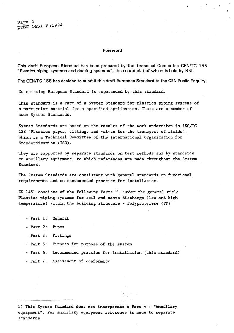 This part of EN 1451 specifies the recommended practice for installation of polypropylene (PP) piping systems in the field of soil and waste discharge (low and high temperature) inside buildings (marked with "B") and for soil and waste discharge systems for both inside buildings and buried in ground within the building structure (marked with "BD").