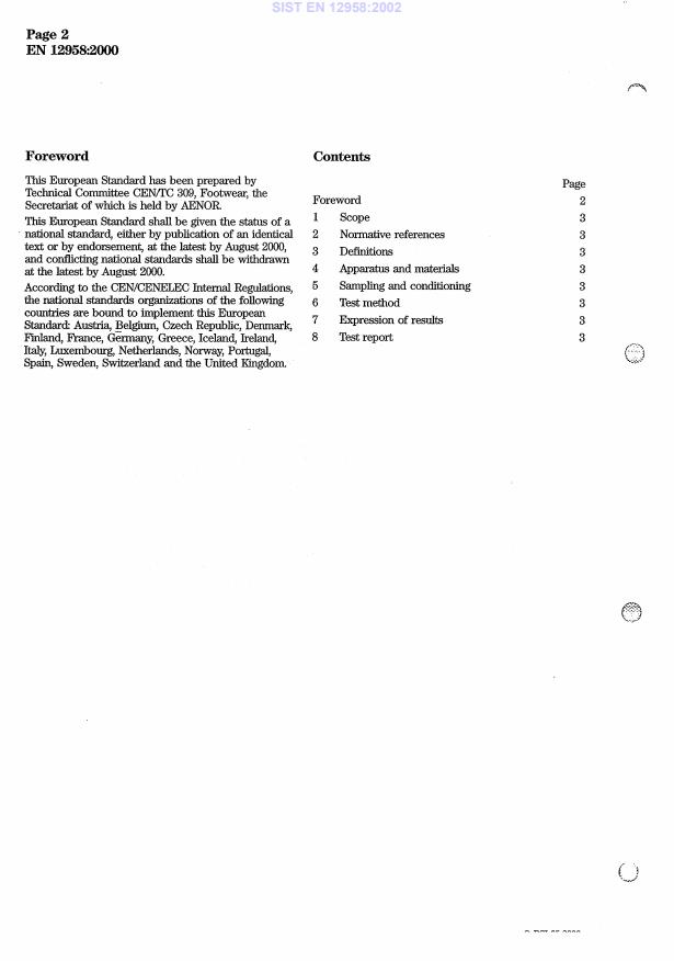 EN 12958:2000 is a standard published by the European Committee for Standardization (CEN). Its full title is "Footwear - Test methods for shanks - Fatigue resistance". This standard covers: This European Standard specifies a method for assessing the fatigue resistance of steel shanks used for the reinforcement of the waist region of women's shoes and of some men's and children's shoes.