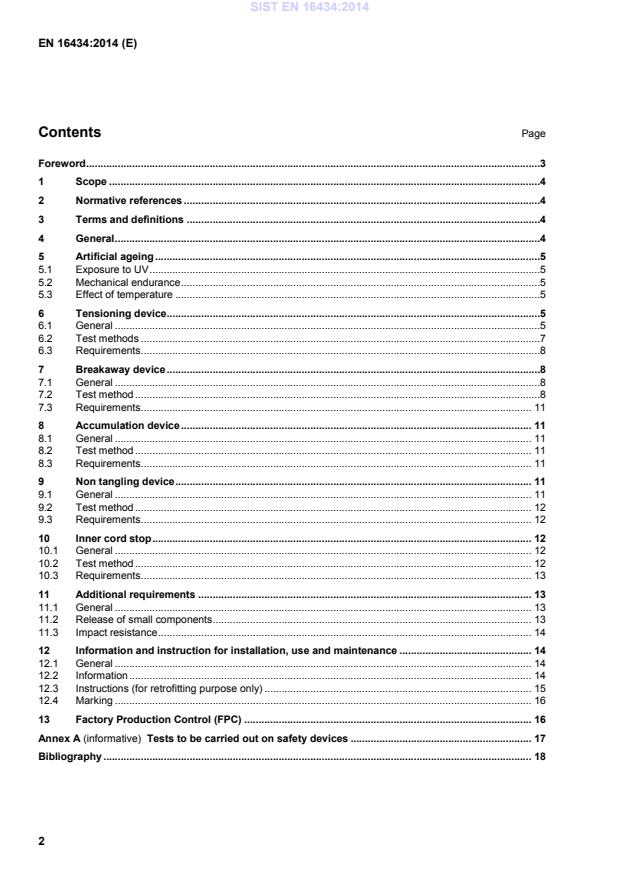Scope This European Standard specifies requirements and test methods for safety devices to be used for protection from strangulation in internal blinds as specified in EN 13120 and insect screens as specified in EN 13561. These devices might be fitted to internal blinds and insect screens at the time of manufacture or for retrofitting. This European Standard applies to any design of device including the following: — tensioning devices; — breakaway devices; — accumulation devices; — non tangling devices; — inner cord stops. Although at the time this standard has been published, no product standard exists for draperies, requirements and test methods specified in the present standard may be applied to safety devices used in such products. For clarification purpose, the term “internal blinds” used in the present standard should mean “internal blinds and insect screens”. 2 Normative references The following documents, in whole or in part, are normatively referenced in this document and are indispensable for its application. For dated references, only the edition cited applies. For undated references, the latest edition of the referenced document (including any amendments) applies. EN 12216, Shutters, external blinds, internal blinds - Terminology, glossary and definitions EN 13120, Internal blinds - Performance requirements including safety EN 13561, External blinds - Performance requirements including safety EN 14201, Blinds and shutters - Resistance to repeated operations (mechanical endurance) - Methods of testing EN 71-1, Safety of toys - Part 1: Mechanical and physical properties EN ISO 4892-2, Plastics - Methods of exposure to laboratory light sources - Part 2: Xenon-arc lamps (ISO 4892-2) EN ISO 4892-3, Plastics - Methods of exposure to laboratory light sources - Part 3: Fluorescent UV lamps (ISO 4892-3) 3 Terms and definitions For the purposes of this document, the terms and definitions given in EN 12216, EN 13561 and EN 13120 apply. 4 General In the testing of safety devices, all related parts associated with the protection from strangulation shall be included. SIST EN 16434:2014