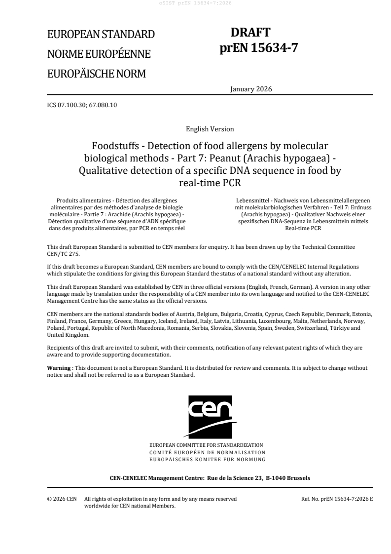 prEN 15634-7 is a draft published by the European Committee for Standardization (CEN). Its full title is "Foodstuffs - Detection of food allergens by molecular biological methods - Part 7: Peanut (Arachis hypogaea) - Qualitative detection of a specific DNA sequence in food by real-time PCR". This standard covers: This document specifies a method for the qualitative detection of peanut (Arachis hypogaea) DNA in food using real-time PCR and targeting a multicopy mitochondrial sequence, in the context of allergen analyses. The method was previously validated in an interlaboratory study (ring trial) and applied to DNA extracted from samples that consist of defined proportions of peanut in rice biscuits, wheat biscuits, cooked sausage and milk powder. The limit of detection of the peanut real-time PCR has been determined experimentally to be at least 0,5 mg peanut/kg.
