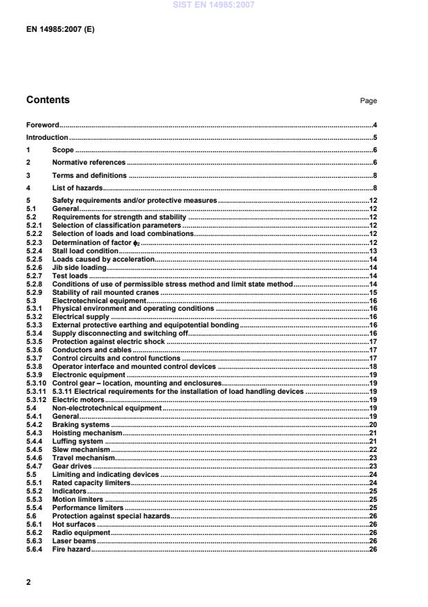 EN 14985:2007 is a standard published by the European Committee for Standardization (CEN). Its full title is "Cranes - Slewing jib cranes". This standard covers: This European Standard applies to power operated slewing jib cranes mounted in one position or free to travel on horizontal rails. It does not apply to wall mounted, pillar or workshop jib cranes. This European Standard is not applicable to erection, dismantling operations, or changing the configuration of the crane. This European Standard gives requirements for all significant hazards, hazardous situations and events relevant to slewing jib cranes, when used as intended and under conditions foreseen by the manufacturer (see Clause 4). The specific hazards due to potentially explosive atmospheres, ionising radiation, and operation in electromagnetic fields beyond the range of EN 61000-6-2 are not covered by this European Standard. This European Standard does not include requirements for the lifting of persons. This European Standard is applicable to slewing jib cranes, which are manufactured after the date of approval by CEN of this European Standard. This European Standard is not applicable to slewing jib cranes which are manufactured before the date of its publication as EN.