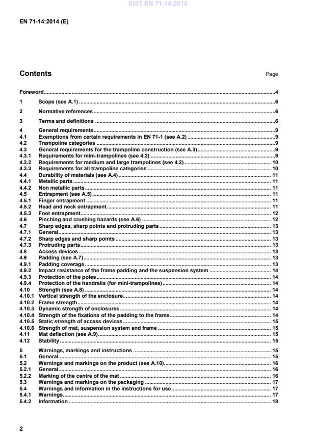 EN 71-14:2014 is a standard published by the European Committee for Standardization (CEN). Its full title is "Safety of toys - Part 14: Trampolines for domestic use". This standard covers: This European Standard specifies requirements and test methods for trampolines for domestic use, their access devices and their enclosures, intended for outdoor and/or indoor use above ground level by one person at a time. The scope of this European Standard excludes: - trampolines used as gymnastic equipment, covered by EN 13219; - floating inflatable trampolines, covered by the EN 15649 series; - trampolines used in public playgrounds; - inclined mat trampolines; - inflatable trampolines; - fitness trampolines, including trampolines for medical use; - trampolines with additional features, e.g. tents, basket ball hoop; - trampolines for domestic use buried at ground level.