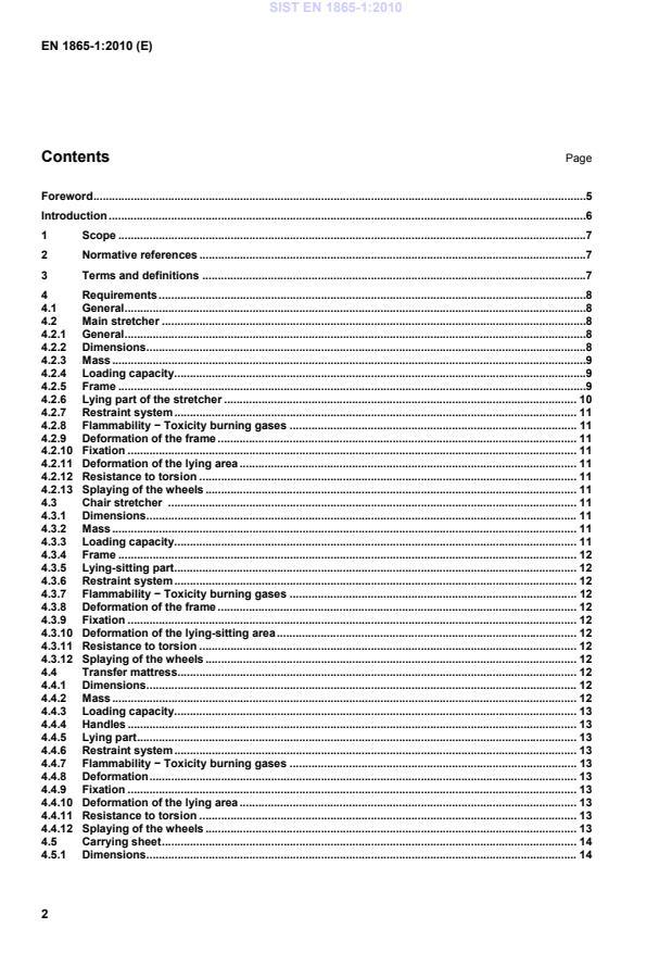................................................................................................................................... 114.3.1 Dimensions .......................................................................................................................................... 114.3.2 Mass ..................................................................................................................................................... 114.3.3 Loading capacity................................................................................................................................. 114.3.4 Frame ................................................................................................................................................... 124.3.5 Lying-sitting part................................................................................................................................. 124.3.6 Restraint system ................................................................................................................................. 124.3.7 Flammability − Toxicity burning gases ............................................................................................ 124.3.8 Deformation of the frame ................................................................................................................... 124.3.9 Fixation ................................................................................................................................................ 124.3.10 Deformation of the lying-sitting area ................................................................................................ 124.3.11 Resistance to torsion ......................................................................................................................... 124.3.12 Splaying of the wheels ....................................................................................................................... 124.4 Transfer mattress................................................................................................................................ 124.4.1 Dimensions .......................................................................................................................................... 124.4.2 Mass ..................................................................................................................................................... 124.4.3 Loading capacity................................................................................................................................. 134.4.4 Handles ................................................................................................................................................ 134.4.5 Lying part ............................................................................................................................................. 134.4.6 Restraint system ................................................................................................................................. 134.4.7 Flammability − Toxicity burning gases ............................................................................................ 134.4.8 Deformation ......................................................................................................................................... 134.4.9 Fixation ................................................................................................................................................ 134.4.10 Deformation of the lying area ............................................................................................................ 134.4.11 Resistance to torsion ......................................................................................................................... 134.4.12 Splaying of the wheels ....................................................................................................................... 134.5 Carrying sheet ..................................................................................................................................... 144.5.1 Dimensions .......................................................................................................................................... 14SIST EN 1865-1:2010