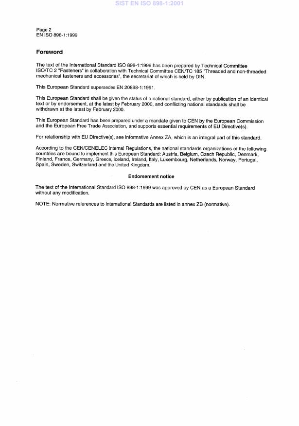 EN ISO 898-1:1999 is associated with the following European legislation: EU Directives/Regulations: 87/404/EEC; Standardization Mandates: M/BC/CEN/89/2. When a standard is cited in the Official Journal of the European Union, products manufactured in conformity with it benefit from a presumption of conformity with the essential requirements of the corresponding EU directive or regulation.