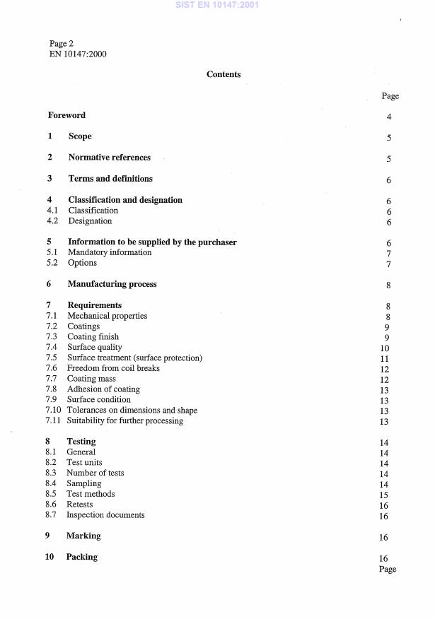 EN 10147:2000 is a standard published by the European Committee for Standardization (CEN). Its full title is "Continuously hot-dip zinc coated structural steels strip and sheet - Technical delivery conditions". This standard covers: 1.1 This European Standard specifies requirements for continuously hot-dip zinc coated flat products in thicknesses </- 3,0 mm made of the steels given in Table1. The thickness is the final thickness of the delivered product after zinc coating. This European Standard applies to strip of all widths and to sheets cut from it (>/- 600 mm width) and cut lengths (< 600 mm width). The types of coating, coating masses and coating finishes available, and surface qualities are given in Tables 2 to 4 (see also 7.2 to 7.4).