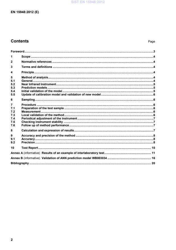 NOTE The minimum performance given in Table 1 includes the variation of reference data as documented by the number of reference labs involved, regional and genetic variations, the number of countries and crop species involved and the robustness over the last five years (see also Annex B). 5.5 Update of calibration model and validation of new model The prediction model in accordance with this standard shall be updated by the one issuing the calibration model to ensure inclusion of new climatic crop conditions and new varieties introduced on the market. These updates shall be made by keeping the original database with addition of the new samples as needed. The new prediction model shall be updated according to EN ISO 12099. Validation shall be made according to the initial validation (5.3) and include at least 20 new samples. 6 Sampling Sampling is not part of the method specified in this European Standard. A recommended sampling procedure is given in EN ISO 24333 [2]. It is important that the sample analyzed in routine is truly representative for the batch and has not been damaged or modified. 7 Procedure 7.1 Preparation of the test sample No specific sample preparation is required. 7.2 Measurement Follow the instructions of the instrument manufacturer. 7.3 Local validation of the method Before use, the method shall be validated on an independent test set that is representative of the sample population to be analyzed. For the determination of bias, at least 10 samples are needed; for the determination of Standard Error of Prediction (SEP, see EN ISO 12099:2010, Clause 6.5) at least 20 samples SIST EN 15948:2012
