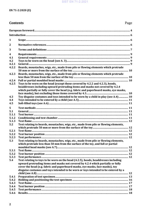 EN 71-2:2020 is a standard published by the European Committee for Standardization (CEN). Its full title is "Safety of toys - Part 2: Flammability". This standard covers: This European Standard specifies the categories of flammable materials which are prohibited in all toys, and requirements concerning flammability of certain toys when they are subjected to a small source of ignition. The test methods described in Clause 5 are used for the purposes of determining the flammability of toys under the particular test conditions specified. The test results thus obtained cannot be considered as providing an overall indication of the potential fire hazard of toys or materials when subjected to other sources of ignition. This European Standard includes general requirements relating to all toys and specific requirements and methods of test relating to the following toys, which are considered as being those presenting the greatest hazard: — toys to be worn on the head: beards, moustaches, wigs, etc. made from hair, pile or material with similar features; masks; hoods, head-dresses, etc.; flowing elements of toys to be worn on the head, but excluding paper novelty hats of the type usually supplied in party crackers; — toy disguise costumes and toys intended to be worn by a child in play; — toys intended to be entered by a child; — soft-filled toys. NOTE Additional requirements for flammability of electric toys are specified in EN 62115.