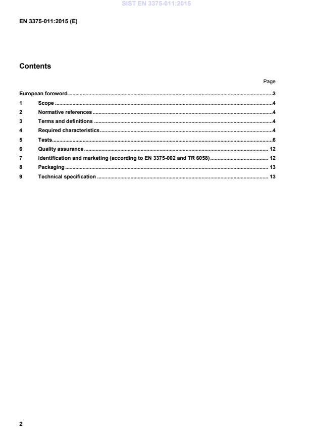 Page European foreword .3 1 Scope .4 2 Normative references .4 3 Terms and definitions .4 4 Required characteristics .4 5 Tests .6 6 Quality assurance . 12 7 Identification and marketing (according to EN 3375-002 and TR 6058) . 12 8 Packaging . 13 9 Technical specification . 13