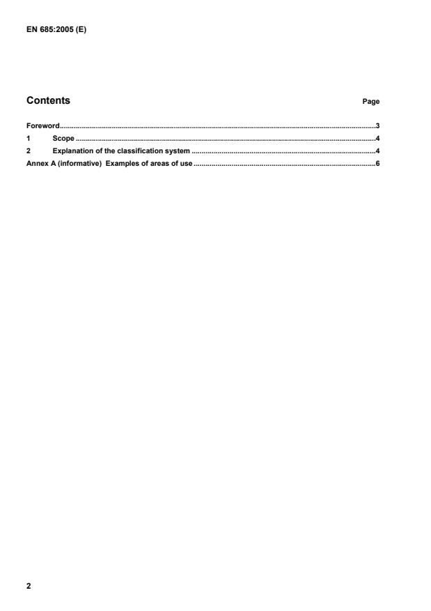 EN 685:2005 is a standard published by the European Committee for Standardization (CEN). Its full title is "Resilient, textile and laminate floor coverings - Classification". This standard covers: This European Standard establishes a classification system for resilient, textile and laminate floor coverings. The classification is based on practical requirements for areas of use and intensity of use and is linked to the requirements specified in the European Standard for each type of floor covering. This European Standard is also intended to give guidance to manufacturers, specifiers and consumers to enable them to choose the appropriate class of floor covering for any given area of use or specific room. NOTE The wear and appearance of floor coverings are influenced by standards of installation and maintenance, the condition of the subfloor and the kind of use (type of footwear, high concentrations of localized traffic, etc). These factors should be taken into account when using this classification system.