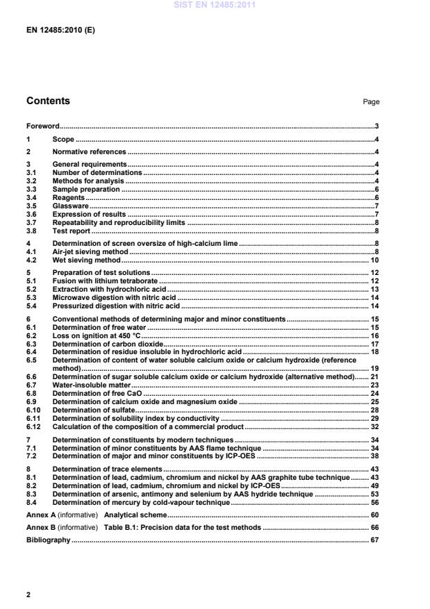 EN 12485:2010 is a standard published by the European Committee for Standardization (CEN). Its full title is "Chemicals used for treatment of water intended for human consumption - Calcium carbonate, high-calcium lime, half-burnt dolomite, magnesium oxide and calcium magnesium carbonate - Test methods". This standard covers: This European Standard specifies the methods used for the chemical analyses and the determination of physical properties of calcium carbonate, high-calcium lime and half-burnt dolomite used to treat water for human consumption. This document describes the reference methods and, in certain cases, an alternative method which can be considered to be equivalent. In the case of a dispute, only the reference methods are used. Any other methods may be used provided they are calibrated, either against the reference methods or against internationally accepted reference materials, in order to demonstrate their equivalence. NOTE Schematic diagrams of the analyses are given in Annex A (Figures A.1 to A.4).