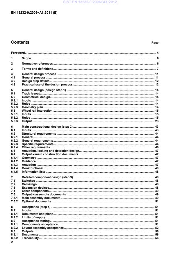 1 Scope The scope of this part is: to describe the design process of switches and crossings, and the use of the other parts of this standard; to define the main criteria to be taken into account during the design of the layout, including the safety and functional dimensions as well as geometrical and material aspects; to define the main criteria to be verified during the design approval; to define the geometrical and non-geometrical acceptance criteria for inspection of layouts assembled both in the fabrication plant and at track site in case of layouts that are delivered non or partially assembled or in a “kit” form; to determine the limits of supply; to define the minimum requirements for traceability. This European Standard applies only to layouts that are assembled in the manufacturing plant or that are assembled for the first time at trackside. Other aspects such as installation and maintenance also influence performance; these are not considered as part of this European Standard. 2 Normative references The following referenced documents are indispensable for the application of this European Standard. For dated references, only the edition cited applies. For undated references, the latest edition of the referenced document (including any amendments) applies. EN 13145, Railway applications — Track — Wood sleepers and bearers EN 13230-4, Railway applications — Track — Concrete sleepers and bearers — Part 4: Prestressed bearers for switches and crossings EN 13232-2, Railway applications — Track — Switches and crossings — Part 2: Requirements for geometric design EN 13232-3, Railway applications — Track — Switches and crossings — Part 3: Requirements for wheel/rail interaction EN 13232-4, Railway applications — Track – Switches and crossings — Part 4: Actuation, locking and detection EN 13232-5, Railway applications — Track — Switches and crossings — Part 5: Switches EN 13232-6, Railway applications — Track — Switches and crossings — Part 6: Fixed common and obtuse crossings EN 13232-7, Railway applications — Track — Switches and crossings — Part 7: Crossings with moveable parts prEN 13232-8, Railway applications — Track — Switches and crossings — Part 8: Expansion devices EN 13481 (all parts), Railway applications — Track — Performance requirements for fastening systems SIST EN 13232-9:2006+A1:2012
