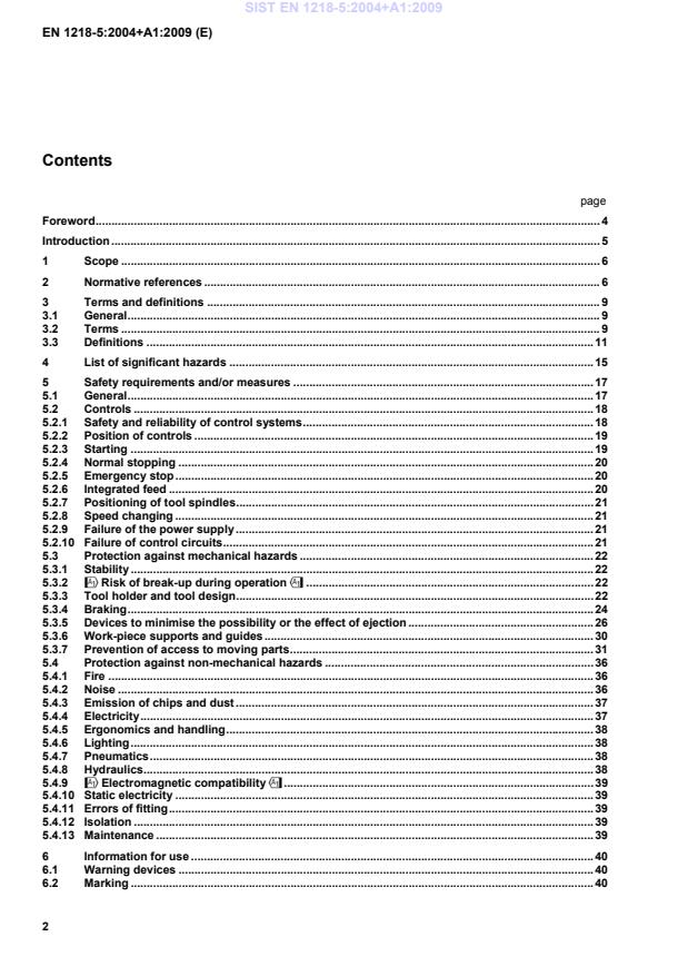 1 Scope !This document specifies all significant hazards, hazardous situations and events as listed in Clause 4 which are relevant to one side profiling machines with fixed table and feed rollers or feed chain hereinafter referred to as "machines", where the loading and unloading is manual and where the maximum work-piece height capacity is 200 mm. The machine is designed to process in one pass one side of solid wood, chip board, fibreboard or plywood and also these materials where they are covered with plastic laminate. The work-piece is fed through the processing units by an integrated feed consisting of rollers or a chain." !deleted text" This document does not apply to transportable machines. This document does not deal with any hazards relating to: a) mechanical loading and/ or unloading of the work-piece; or b) a machine being used in combination with any other machine (as part of a line); or c) use of laser. For Computer Numerically Controlled (CNC) machines this document does not cover hazards related to Electro-Magnetic Compatibility (EMC). NOTE 1 The requirements of this document apply to all machines whatever their method of control e.g. electromechanical and/or electronic. This document is primarily directed to machines which are manufactured after the date of publication by CEN. NOTE 2 Single end tenoning machines with sliding table are dealt with in EN 1218-1:1999. Double end tenoning and/or profiling machines fed by chain or chains are dealt with in EN 1218-2. Single end tenoning machines where the tenon is produced only by means of saw-blades are dealt with in EN 1218-3. 2 Normative references The following referenced documents are indispensable for the application of this document. For dated references, only the edition cited applies. For undated references, the latest edition of the referenced document (including any amendments) applies. !deleted text" !EN 614-1:2006, Safety of machinery — Ergonomic design principles — Part 1: Terminology and general principles" !EN 847-1:2005", Tools for woodworking — Safety requirements — Part 1: Milling tools and circular sawblades !EN 894-1:1997, Safety of machinery — Ergonomics requirements for the design of displays and control actuators — Part 1: General principles for human interactions with displays and control actuators EN 894-2:1997, Safety of machinery — Ergonomics requirements for the design of displays and control actuators — Part 2: Displays SIST EN 1218-5:2004+A1:2009