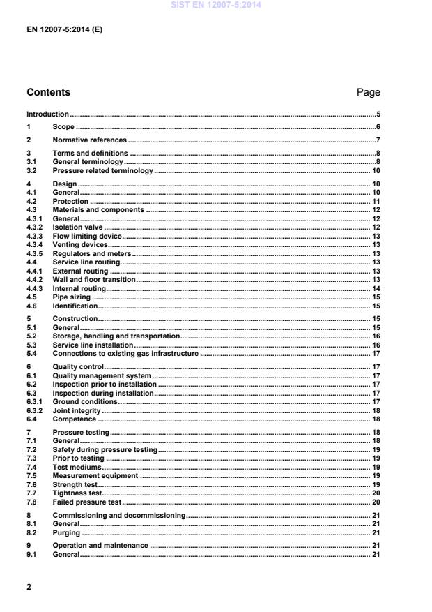 Introduction .5 1 Scope .6 2 Normative references .7 3 Terms and definitions .8 3.1 General terminology .8 3.2 Pressure related terminology . 10 4 Design . 10 4.1 General . 10 4.2 Protection . 11 4.3 Materials and components . 12 4.3.1 General . 12 4.3.2 Isolation valve . 12 4.3.3 Flow limiting device . 13 4.3.4 Venting devices. 13 4.3.5 Regulators and meters . 13 4.4 Service line routing. 13 4.4.1 External routing . 13 4.4.2 Wall and floor transition . 13 4.4.3 Internal routing . 14 4.5 Pipe sizing . 15 4.6 Identification . 15 5 Construction . 15 5.1 General . 15 5.2 Storage, handling and transportation. 16 5.3 Service line installation . 16 5.4 Connections to existing gas infrastructure . 17 6 Quality control . 17 6.1 Quality management system . 17 6.2 Inspection prior to installation . 17 6.3 Inspection during installation . 17 6.3.1 Ground conditions . 17 6.3.2 Joint integrity . 18 6.4 Competence . 18 7 Pressure testing . 18 7.1 General . 18 7.2 Safety during pressure testing . 19 7.3 Prior to testing . 19 7.4 Test mediums . 19 7.5 Measurement equipment . 19 7.6 Strength test . 19 7.7 Tightness test . 20 7.8 Failed pressure test . 20 8 Commissioning and decommissioning . 21 8.1 General . 21 8.2 Purging . 21 9 Operation and maintenance . 21 9.1 General . 21 SIST EN 12007-5:2014