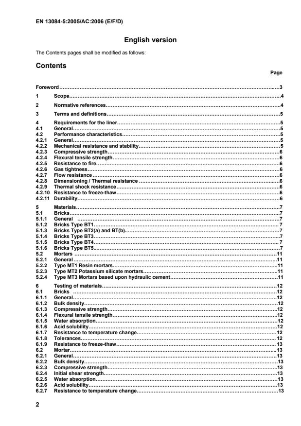 Foreword ……………………………………………………………………………………………………………….…3 1 Scope………………….………………………………………………………………………………………….4 2 Normative references………………………………………………………………………………………….4 3 Terms and definitions………………………………………………………………………………………….5 4 Requirements for the liner…………………………………………………………………………………….5 4.1 General……………………………………………………………………………………………………………5 4.2 Performance characteristics………………………………………………………………………………….5 4.2.1 General……………………………………………………………………………………………………………5 4.2.2 Mechanical resistance and stability…………………………………………………………………………5 4.2.3 Compressive strength …………………………………………………………………………………………6 4.2.4 Flexural tensile strength ………………………………………………………………………………………6 4.2.5 Resistance to fire……………………………………………………………………………………………….6 4.2.6 Gas tightness……………………………………………………………………………………………………6 4.2.7 Flow resistance …………………………………………………………………………………………………6 4.2.8 Dimensioning / Thermal resistance …………………………………………………………………….….6 4.2.9 Thermal shock resistance …………………………………………………………………………………….6 4.2.10 Resistance to freeze-thaw …………………………………………………………………………………….6 4.2.11 Durability…………………………………………………………………………………………………………6 5 Materials………………………………………………………………………………………………………….7 5.1 Bricks…………………………………………………………………………………………………………….7 5.1.1 General …………………………………………………………………………………………………………7 5.1.2 Bricks Type BT1………………………………………………………………………………………………. 7 5.1.3 Bricks Type BT2(a) and BT(b).……………………………………………………………………………… 7 5.1.4 Bricks Type BT3……………………………………………………………………………………………….7 5.1.5 Bricks Type BT4………………………………………………………………………………………………. 7 5.1.6 Bricks Type BT5.………………………………………………………………………………………………7 5.2 Mortars …………………………………………………………………………………………………………11 5.2.1 General .……………………………………………………………………………………………………….11 5.2.2 Type MT1 Resin mortars…………………………………………………………………………………….11 5.2.3 Type MT2 Potassium silicate mortars…………………………………………………………………….11 5.2.4 Type MT3 Mortars based upon hydraulic cement……………………………………………………….11 6 Testing of materials ….………………………………………………………………………………………12 6.1 Bricks ………………………………………………………………………………………………………….12 6.1.1 General…………………………………………………………………………………………………………. 12 6.1.2 Bulk density…………………………………………………………………………………………………….12 6.1.3 Compressive strength……………………………………………………………………………………….12 6.1.4 Flexural tensile strength…………………………………………………………………………………….12 6.1.5 Water absorption………………………………………………………………………………………………12 6.1.6 Acid solubility………………………………………………………………………………………………….12 6.1.7 Resistance to temperature change………………………………………………………………………. 12 6.1.8 Tolerances……………………………………………………………………………………………………. 12 6.1.9 Resistance to freeze-thaw…………………………………………………………………………………. 13 6.2 Mortar…………………………………………………………………………………………………………. 13 6.2.1 General…………………………………………………………………………………………………………. 13 6.2.2 Bulk density…………………………………………………………………………………………………….13 6.2.3 Compressive strength………………………