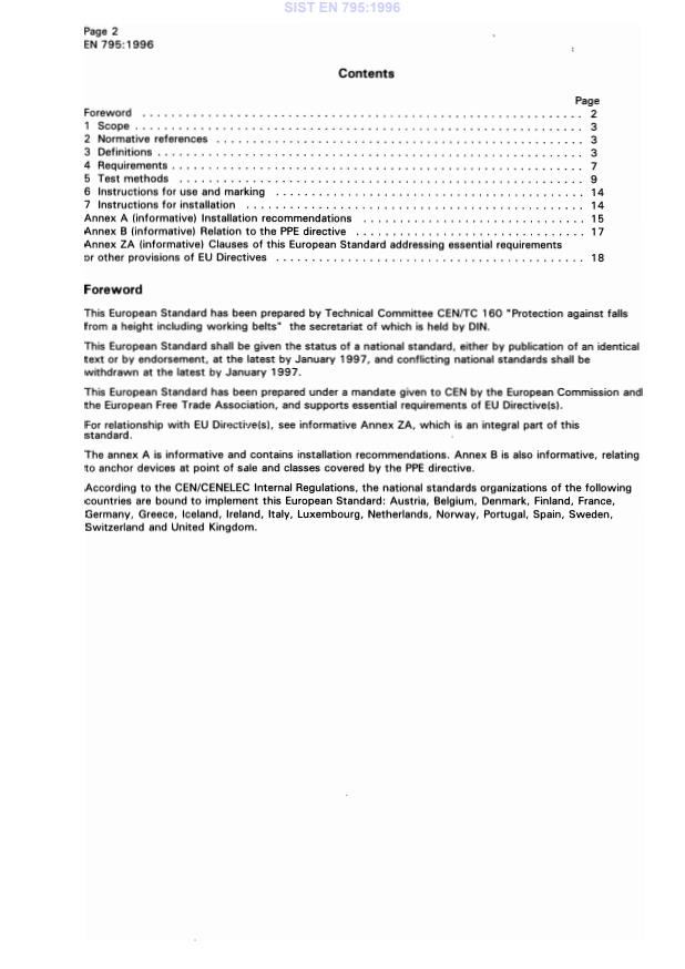EN 795:1996 is a standard published by the European Committee for Standardization (CEN). Its full title is "Protection against falls from a height - Anchor devices - Requirements and testing". This standard covers: This standard specifies requirements, test methods and instructions for use and marking for anchorage devices designed exclusively for use with personal protective equipment against falls from a height. This standard does not apply to hooks designed to EN 517, or walkways to EN 516, nor to fixed anchor points forming part of the original structure.