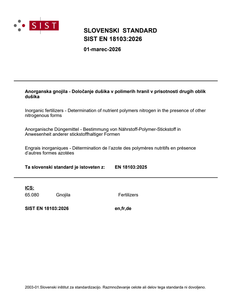 EN 18103:2025 is a standard published by the European Committee for Standardization (CEN). Its full title is "Inorganic fertilizers - Determination of nutrient polymers nitrogen in the presence of other nitrogenous forms". This standard covers: This document specifies a method for the determination of nutrient polymers nitrogen in presence of the other forms of nitrogen in inorganic fertilizers. The method is applicable to all fertilizers which do not contain interfering organic compounds. NOTE Nutrient polymers are methylen-urea (MU), in liquid and in solid form.