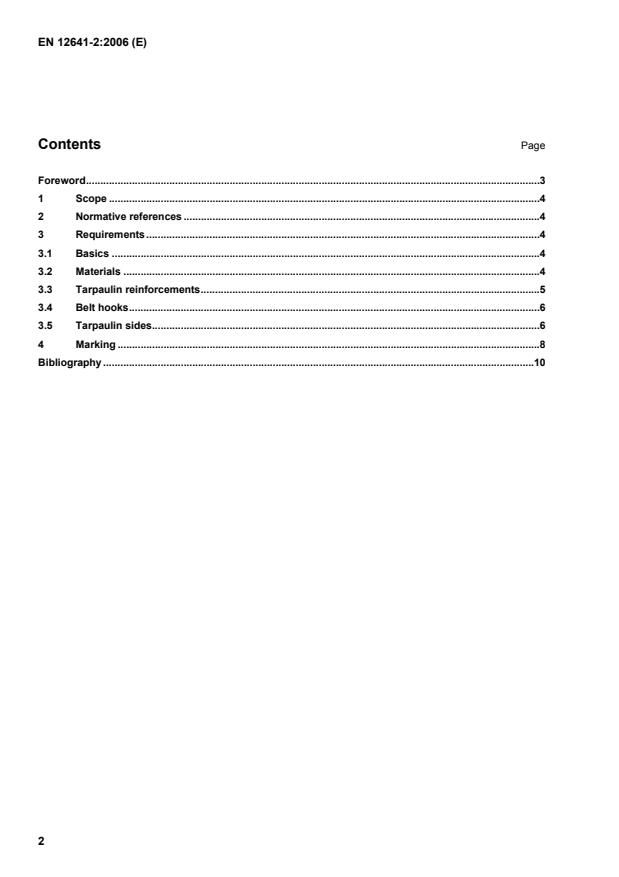 EN 12641-2:2006 is a standard published by the European Committee for Standardization (CEN). Its full title is "Swap bodies and commercial vehicles - Tarpaulins - Part 2: Minimum requirements for curtainsiders". This standard covers: This European Standard specifies minimum requirements for the strength and attachment of tarpaulins used on swap bodies for combined transport and may be used for other applications, e.g. commercial vehicles. NOTE 1 Tarpaulins of commercial vehicles which shall be operated in combined transport (i.e. rolling motorway) may adhere to this European Standard. NOTE 2 Curtainsider tarpaulins which fulfil the requirements of this European Standard are not suitable for securing cargo. This European Standard does not contain any requirements in this respect. Requirements for securing of cargo are given in EN 12640 and prEN 12642 option XL.