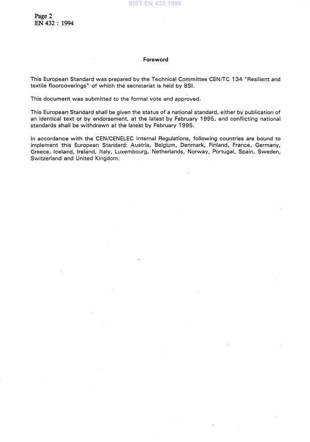 EN 432:1994 is a standard published by the European Committee for Standardization (CEN). Its full title is "Resilient floor coverings - Determination of shear force". This standard covers: This European Standard specifies a method for determining the shear force of layers of a resilient floorcovering.