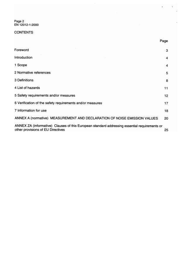 EN 12012-1:2000 is a standard published by the European Committee for Standardization (CEN). Its full title is "Rubber and plastics machines - Size reduction machines - Part 1: Safety requirements for blade granulators". This standard covers: This standard specifies the essential safety requirements applicable to the design and construction of blade granulators used for plastic and rubber. The machine begins with the outer edge of the feed opening or feeding device if it is an integral part of the machine and ends with the discharge area. Significant hazards are listed in clause 4, specific requirements and/or measures applicable to blade granulators are listed in clause 5. This standard applies primarily to machines which are manufactured after the date of publication of this standard.